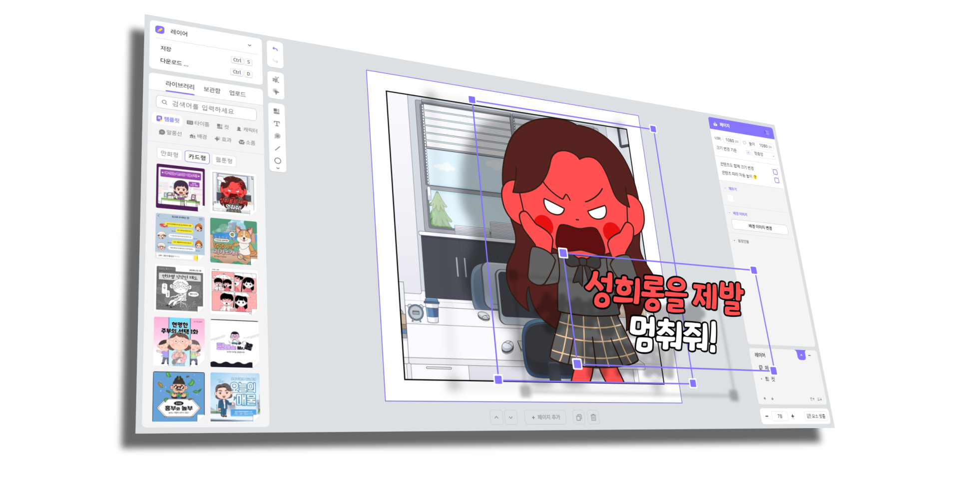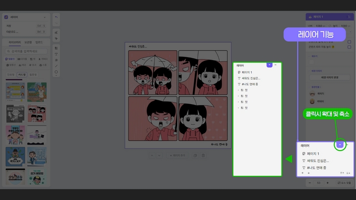 여러 요소(캐릭터, 말풍선, 배경, 컷 등)가 복잡하게 겹쳐져 있을 경우